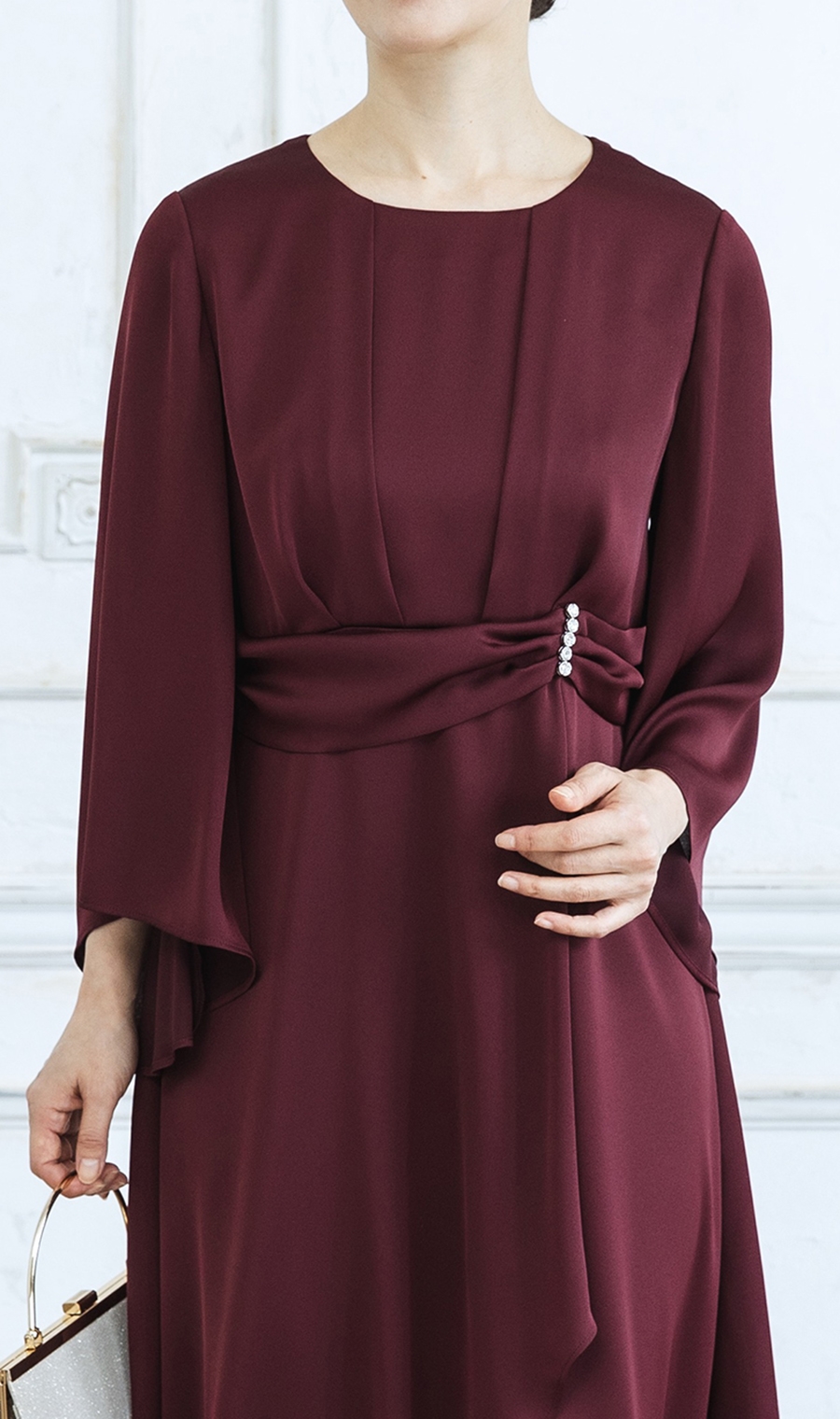 ベルト部分にきらっと光るビジューモチーフを乗せているので、すべて同じ素材で仕立てていてもアクセントになり、華やぎの場にふさわしいスタイルに。