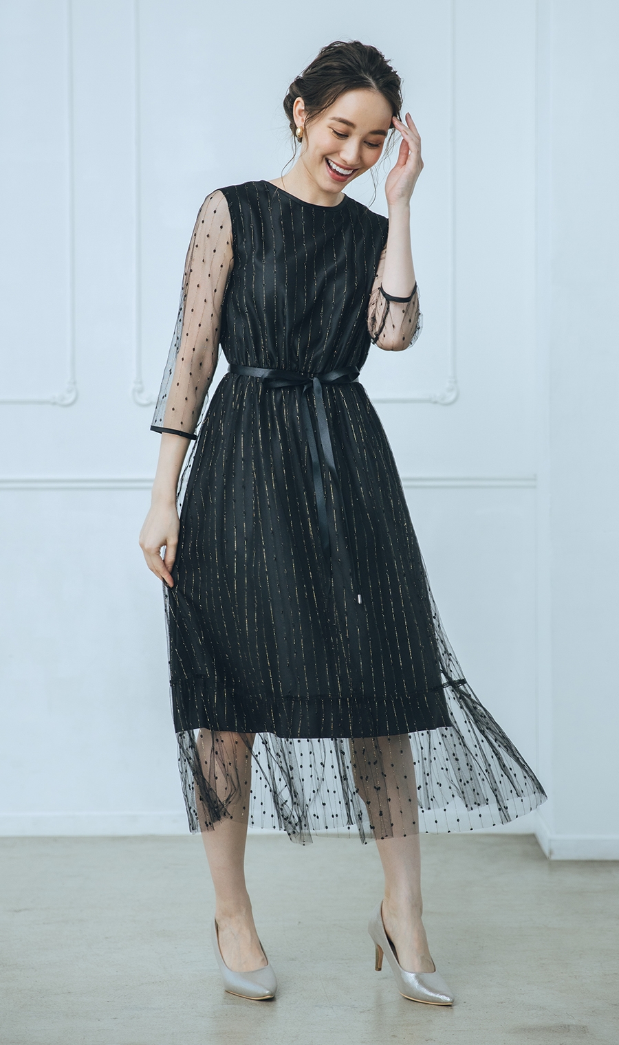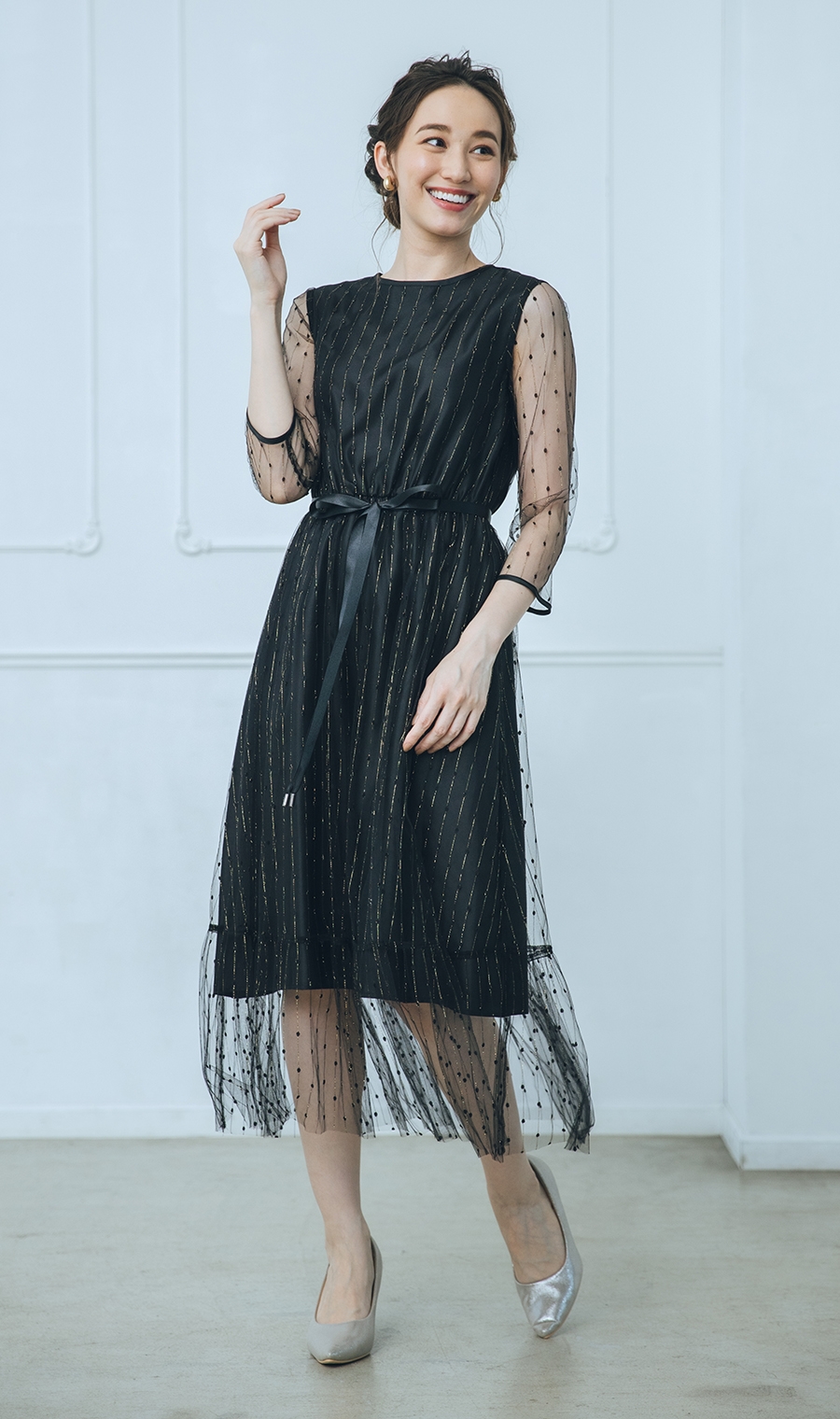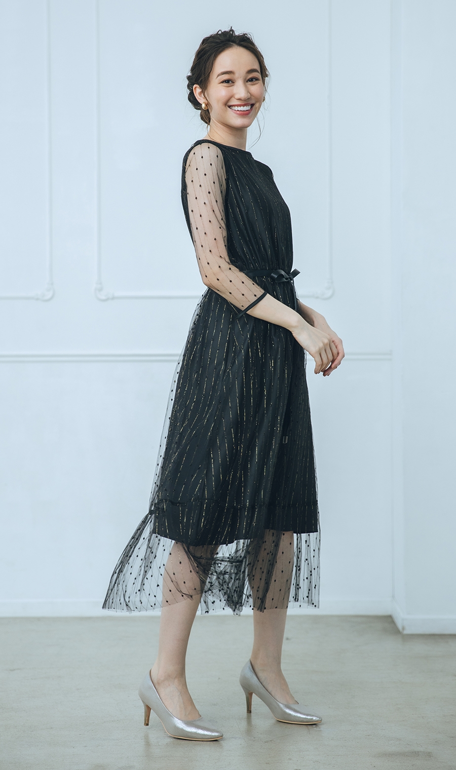 夜のパーティにもおすすめ。チュールの透け感が軽やかで、身長問わず着られそうです。