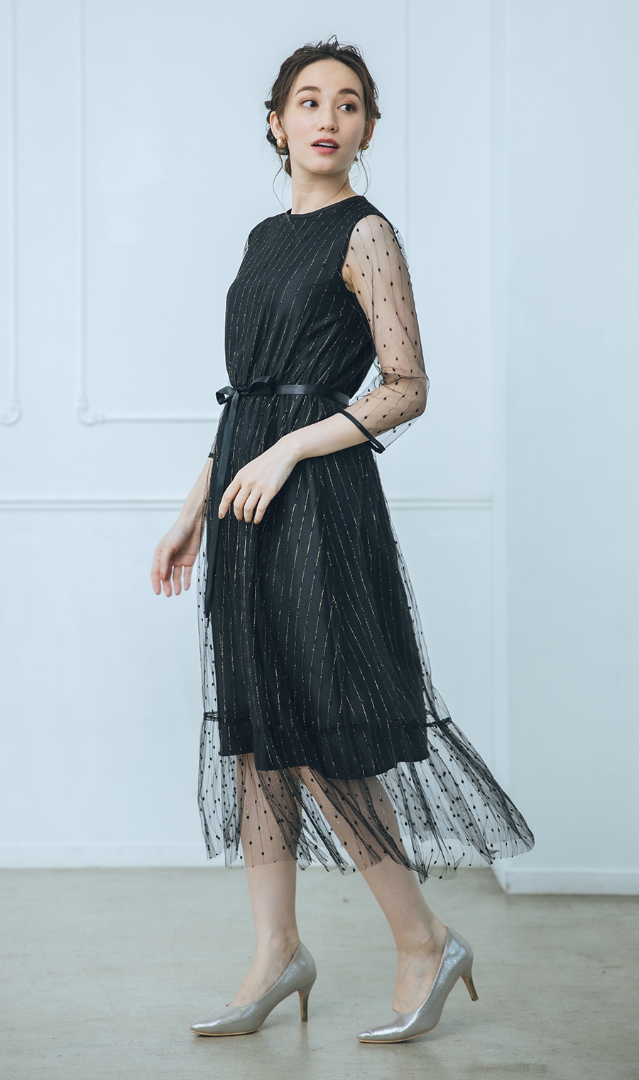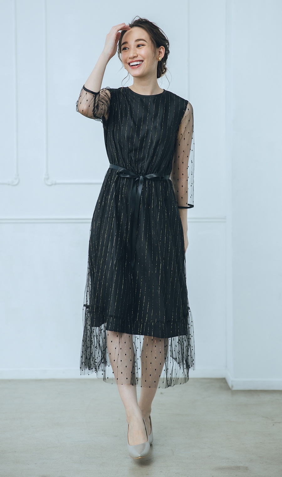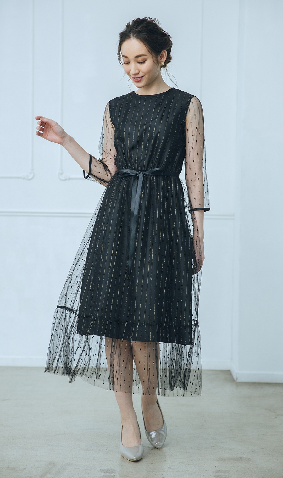 夜のパーティにもおすすめ。チュールの透け感が軽やかで、身長問わず着られそうです。