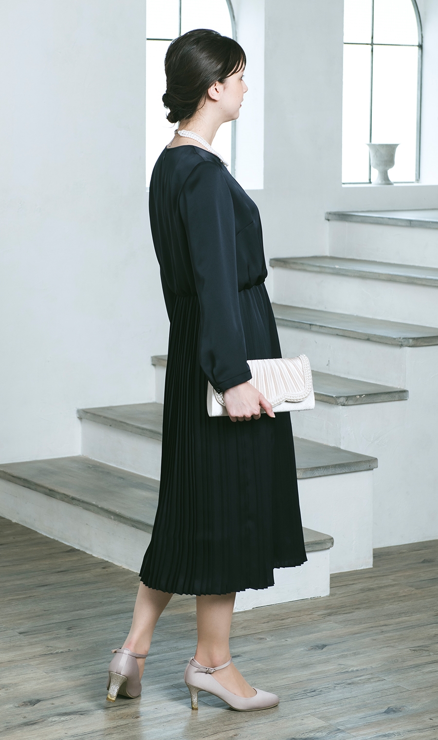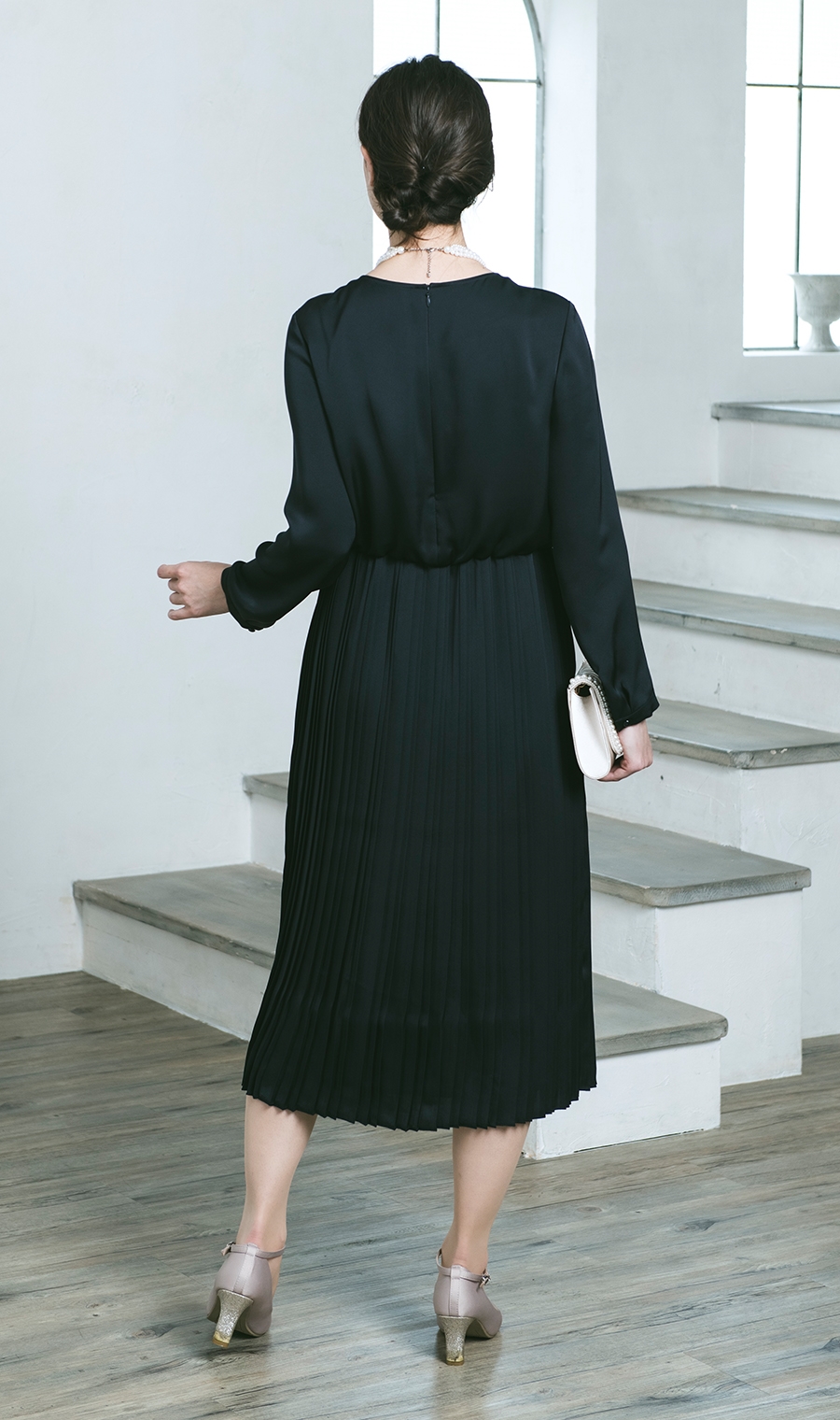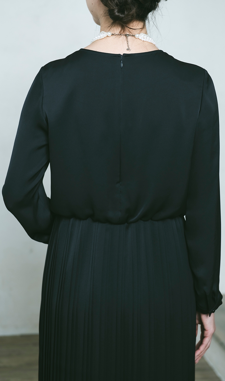 光沢を抑えたサテン素材が、上品で落ち着いた印象を与えるドレス。