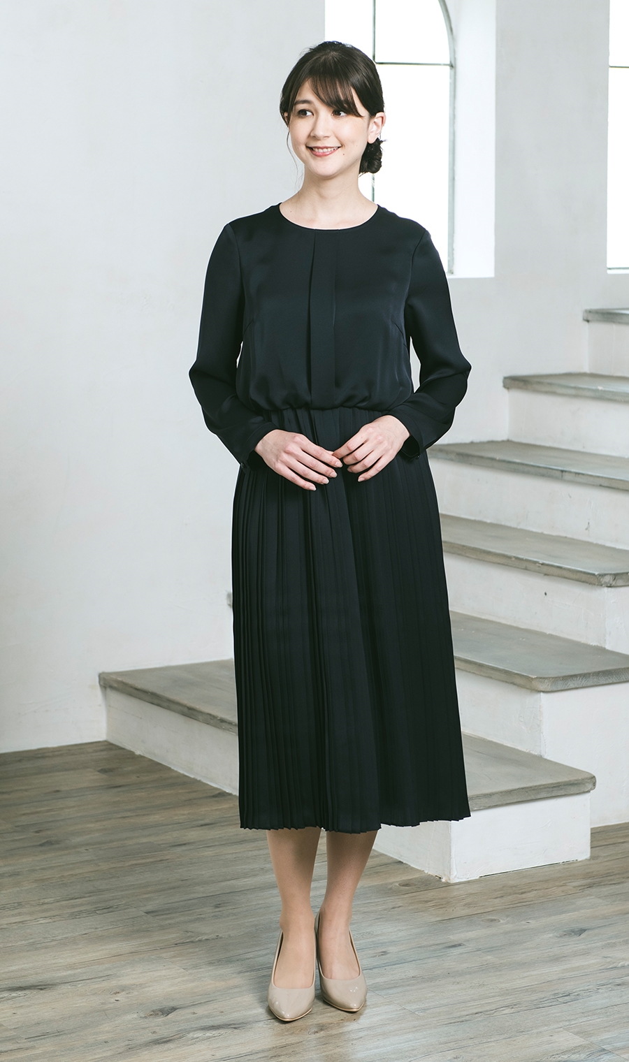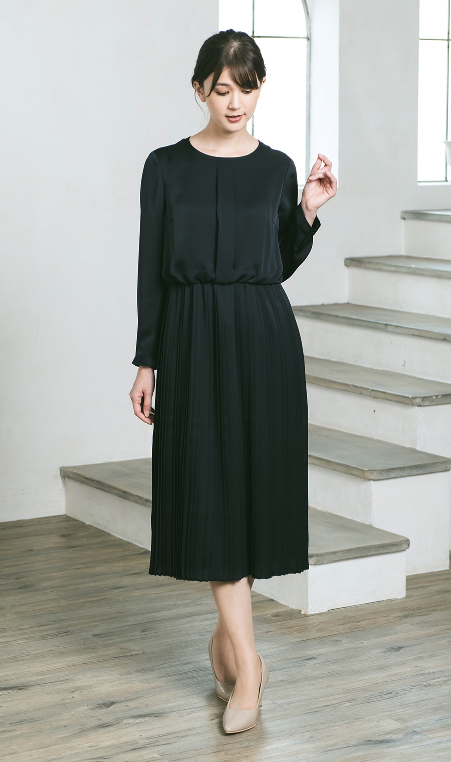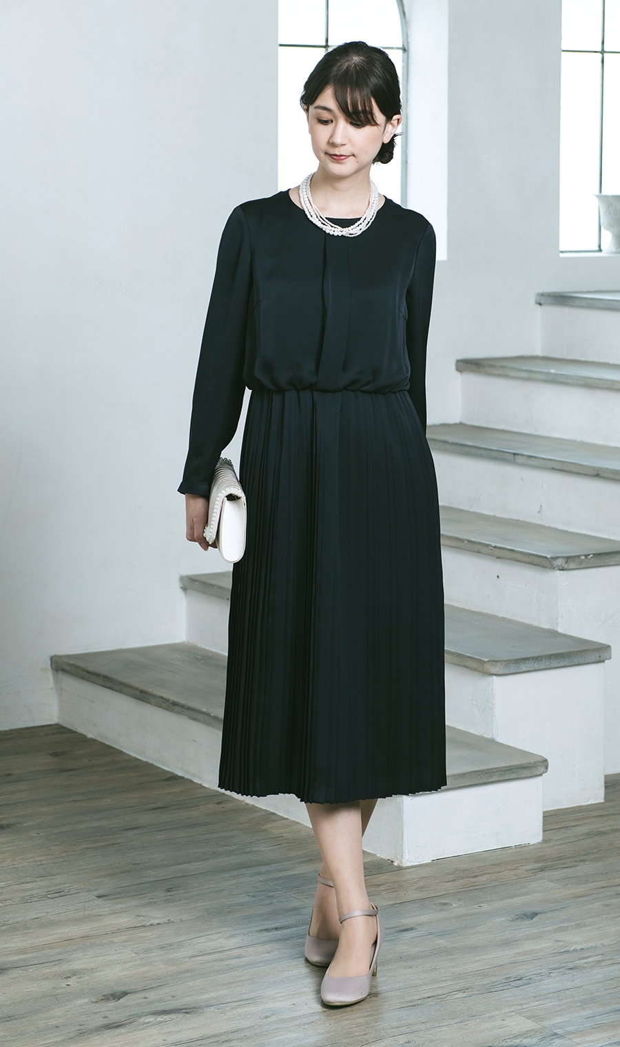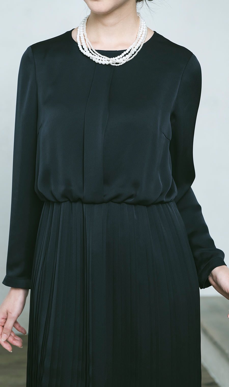 光沢を抑えたサテン素材が、上品で落ち着いた印象を与えるドレス。