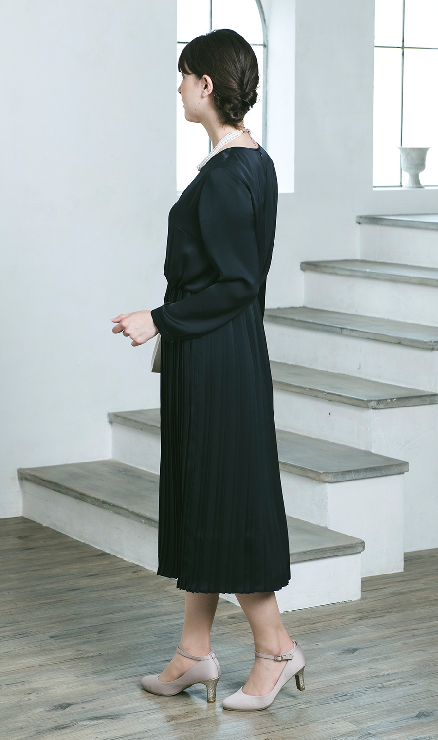 スカートのトリプルサイド加工プリーツが、歩くたびに優雅に揺れ、しなやかな女性らしさを感じさせます。