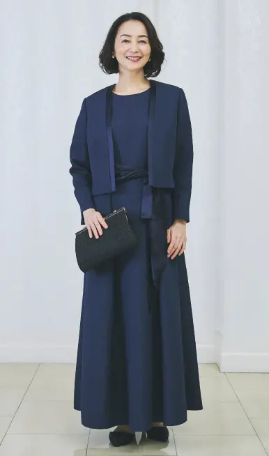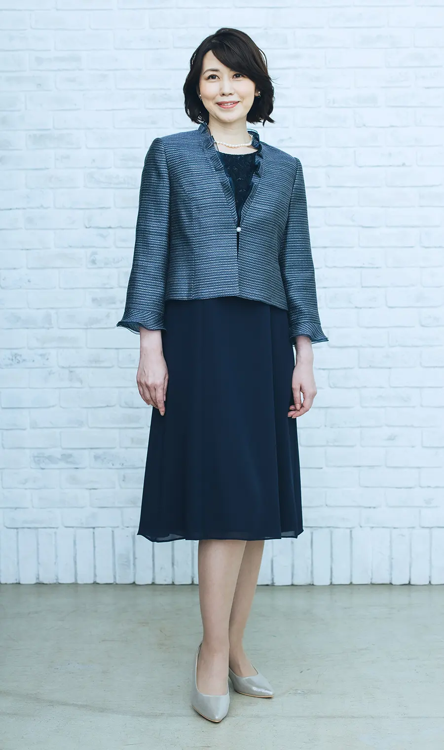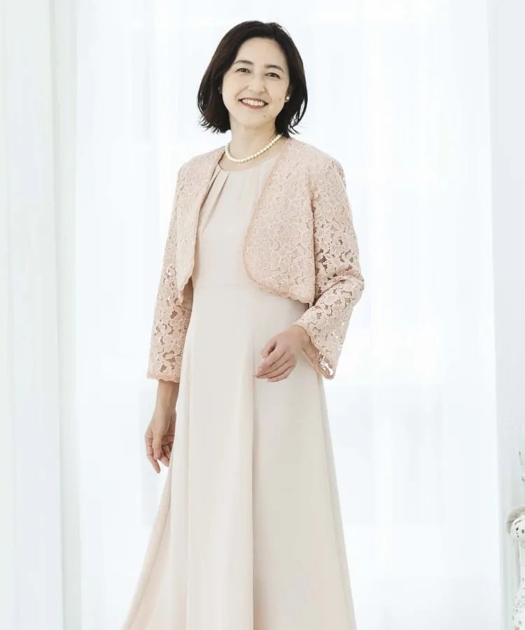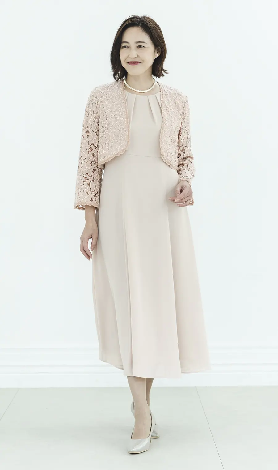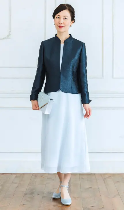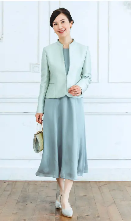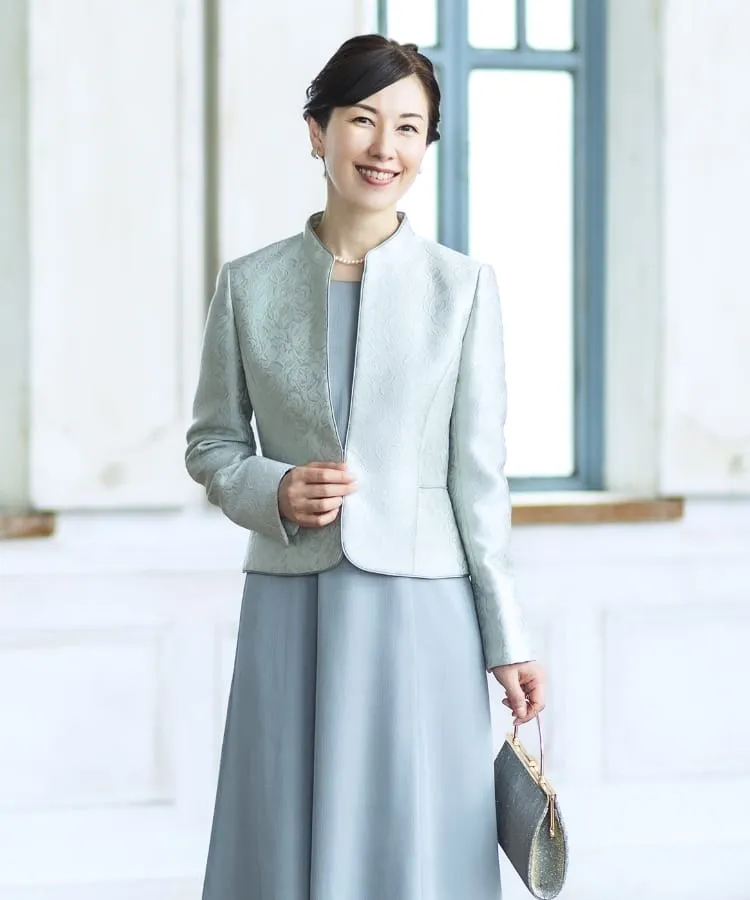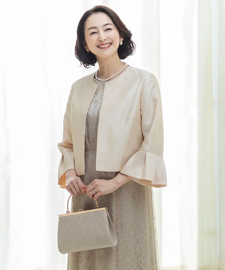 エレガントなワンピースにジャケットを合わせた着こなしは、ミセスドレスの王道ともいえるコーディネート。肌の露出を抑える長めの袖丈が、凛とした気品と清楚なフォーマル感を引き立てます。