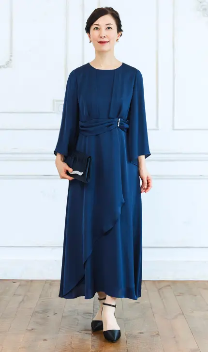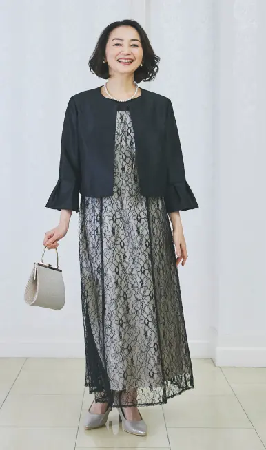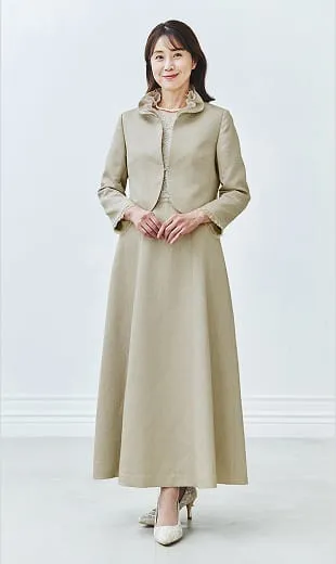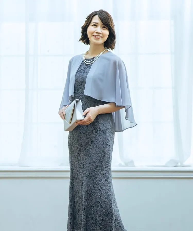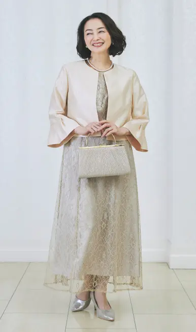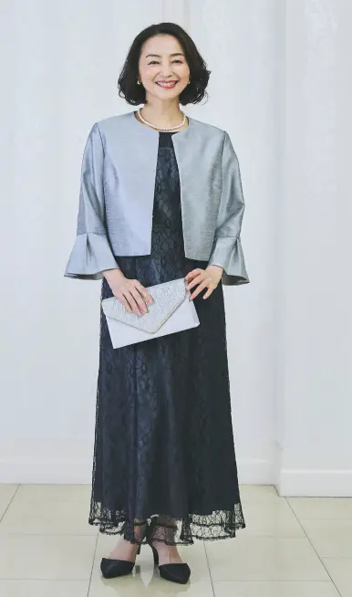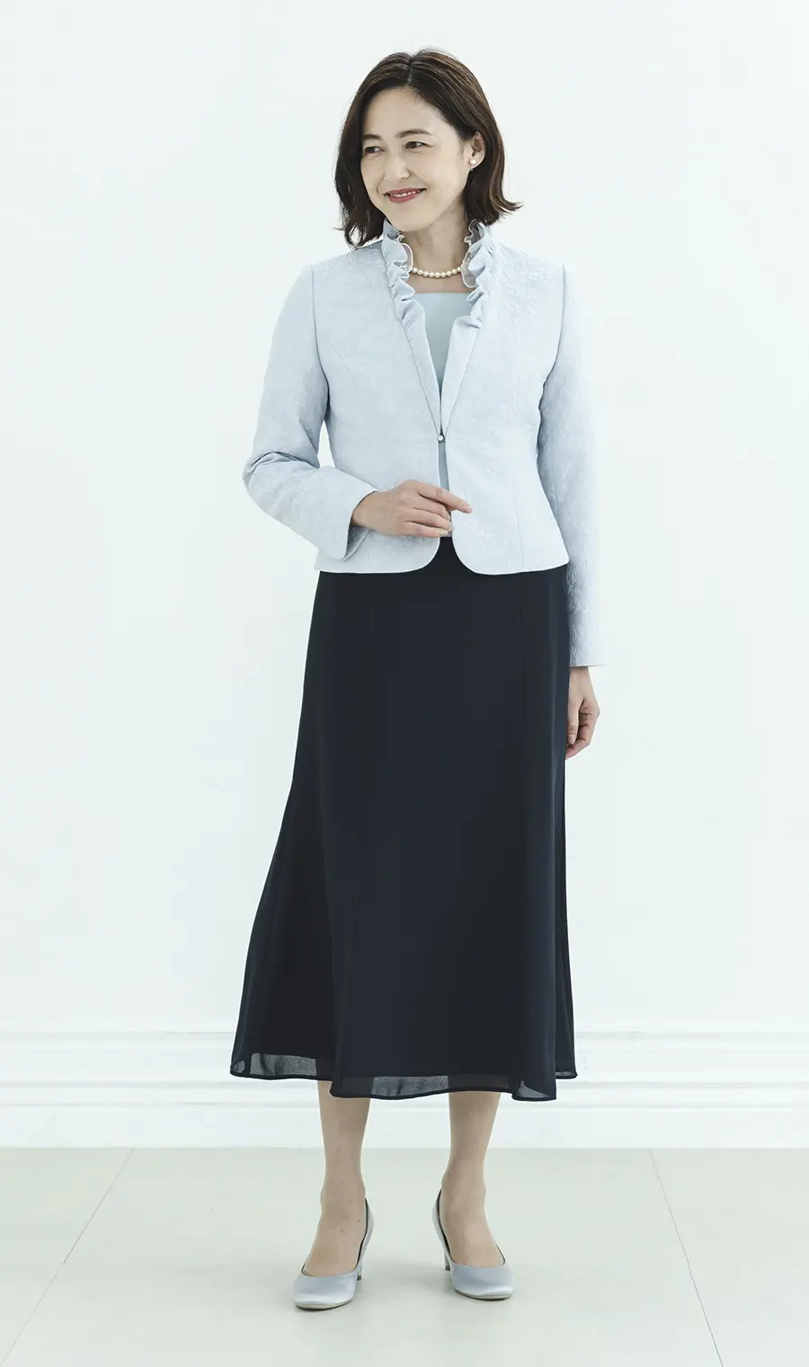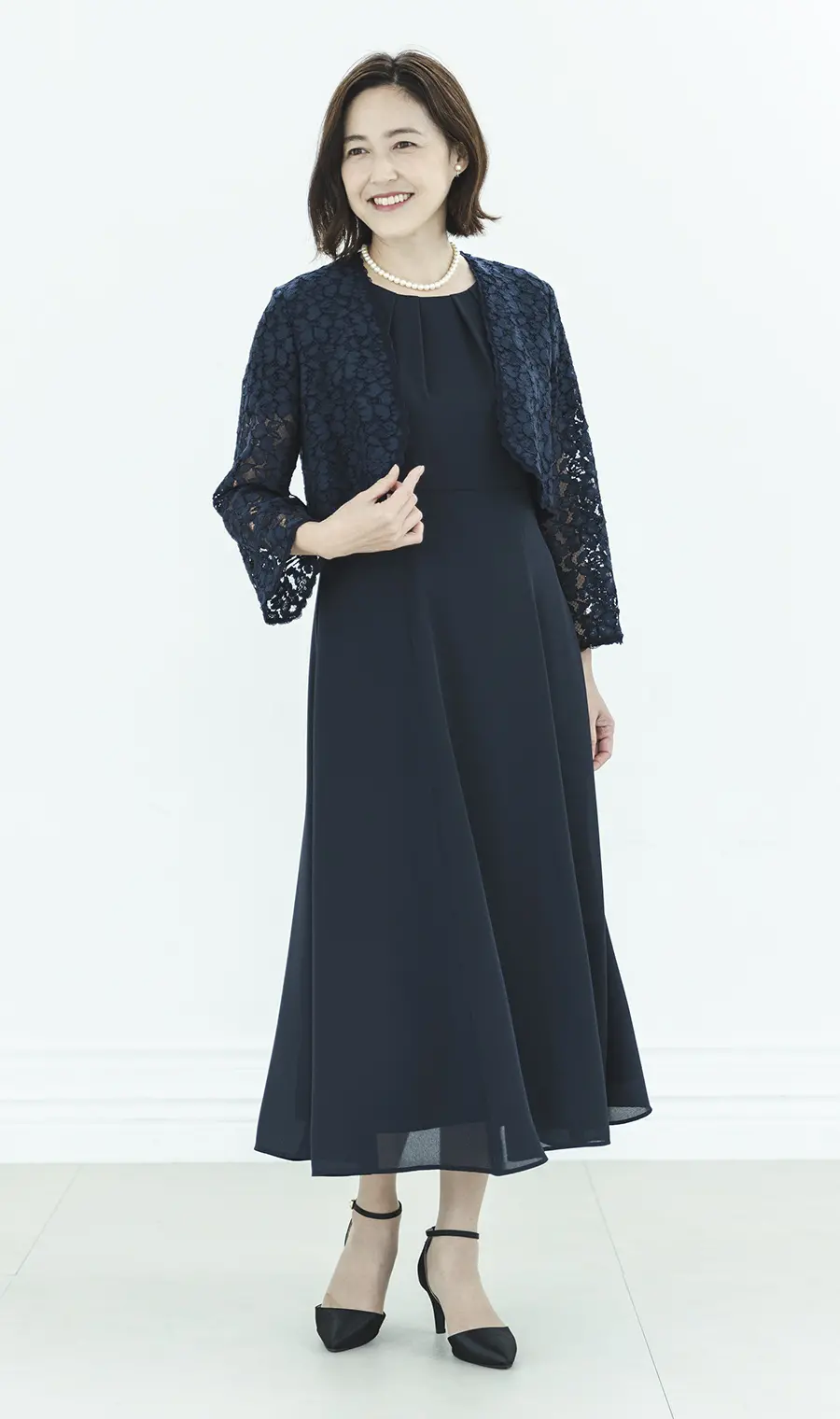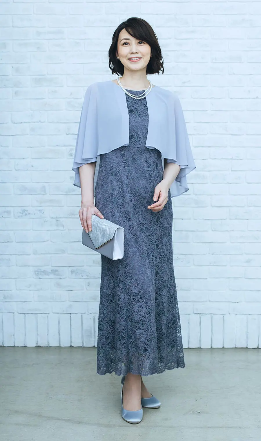 エレガントなワンピースにジャケットを合わせた着こなしは、ミセスドレスの王道ともいえるコーディネート。肌の露出を抑える長めの袖丈が、凛とした気品と清楚なフォーマル感を引き立てます。