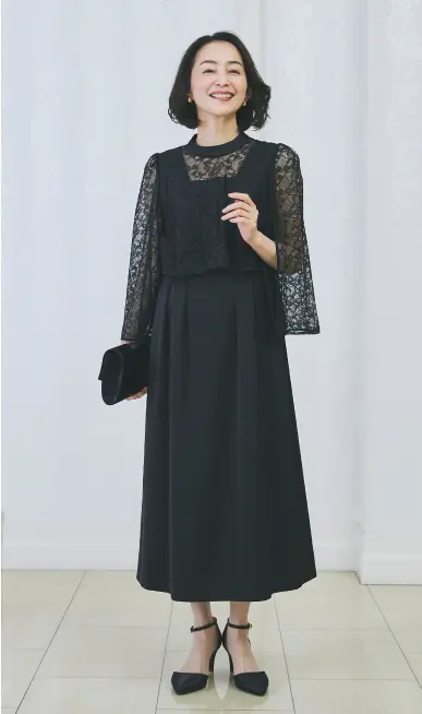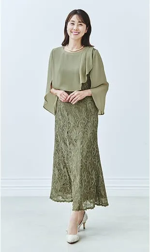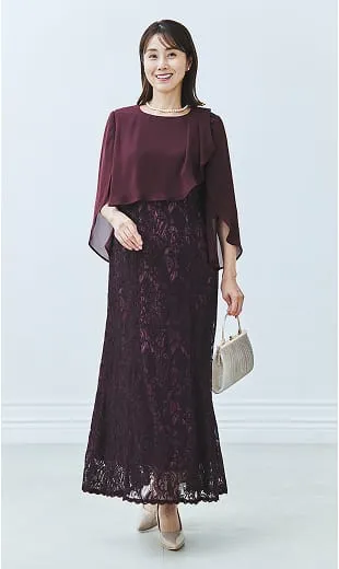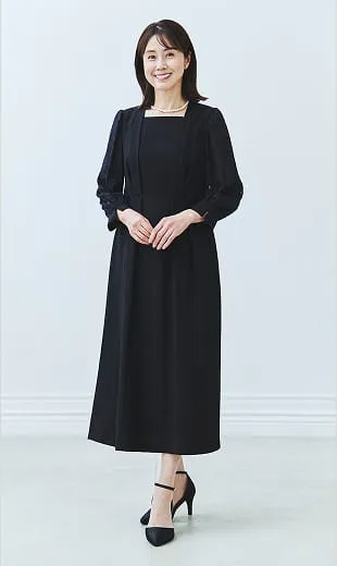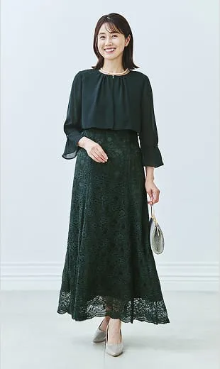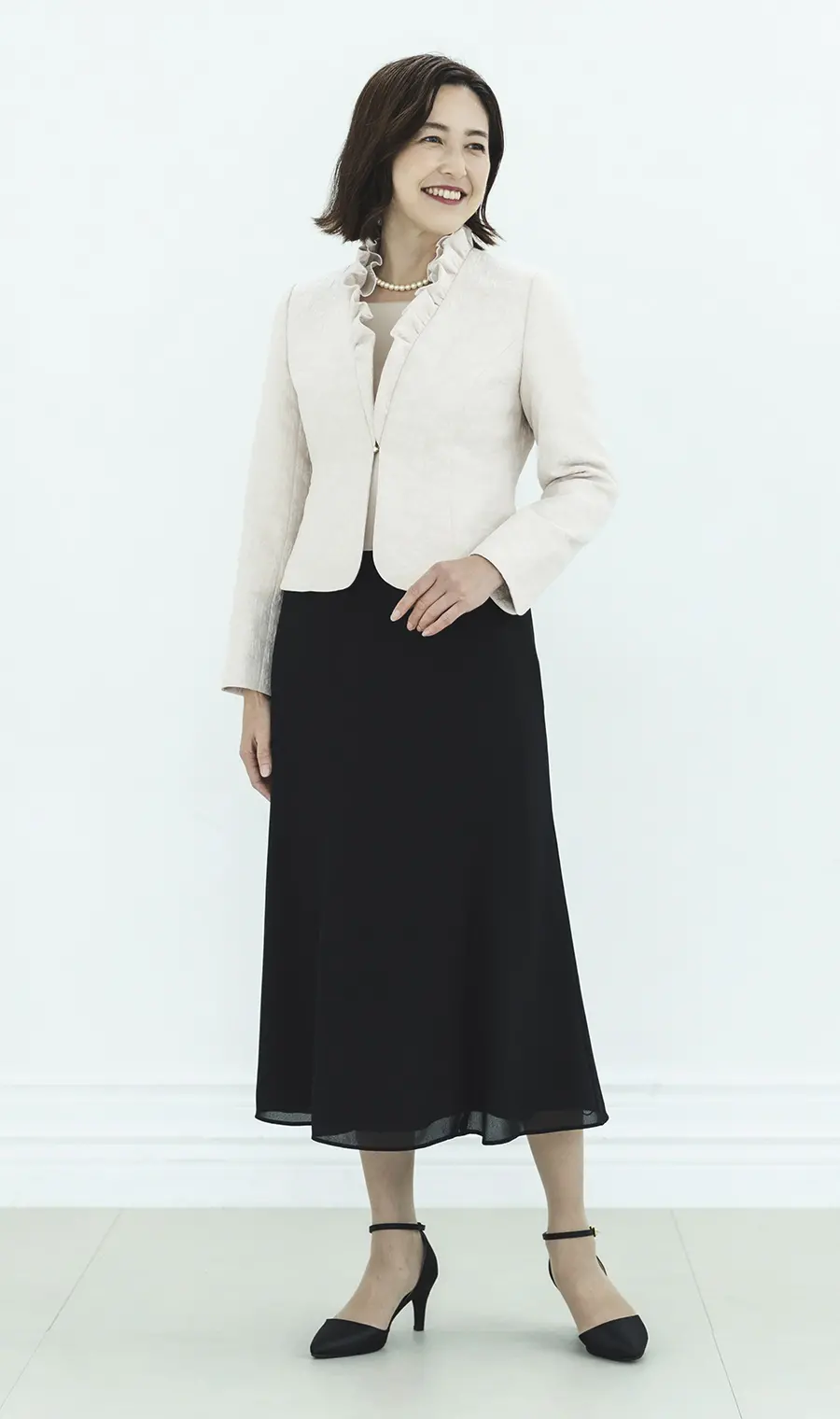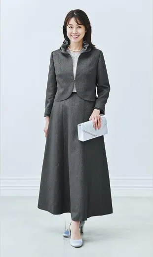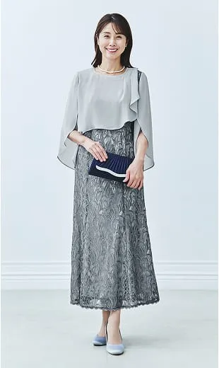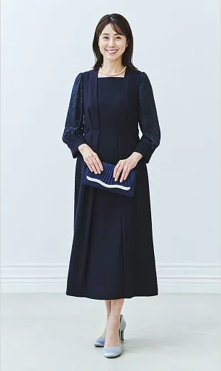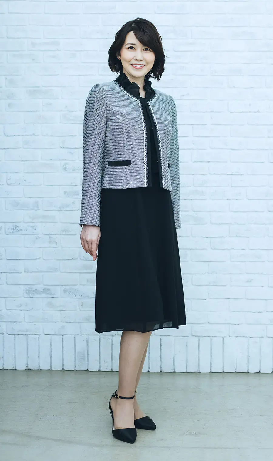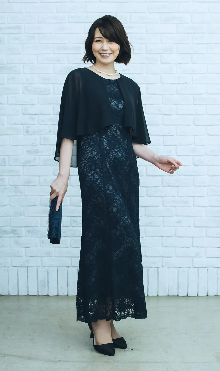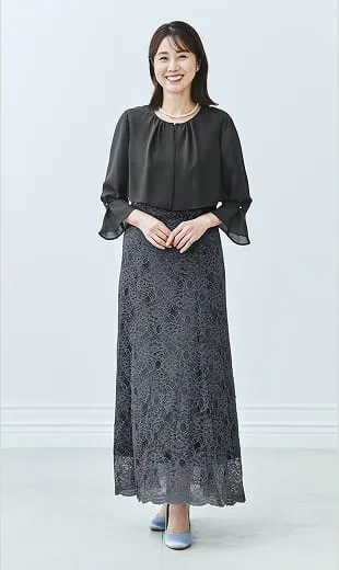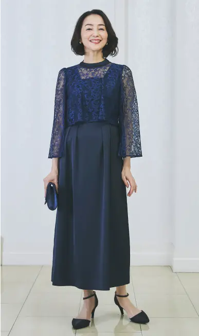 エレガントなワンピースにジャケットを合わせた着こなしは、ミセスドレスの王道ともいえるコーディネート。肌の露出を抑える長めの袖丈が、凛とした気品と清楚なフォーマル感を引き立てます。