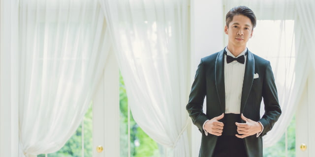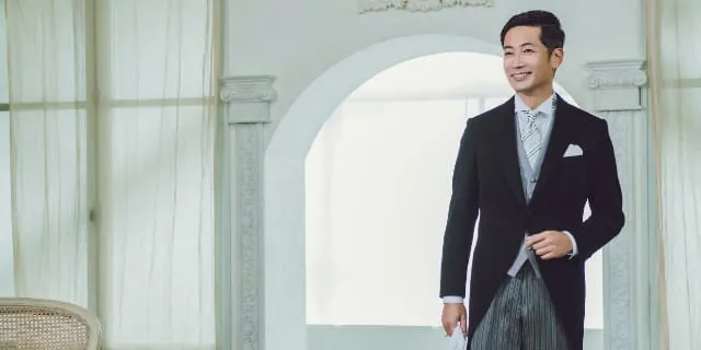 結婚式の新郎、新郎新婦の父、式典での主催者や主賓などが着用するモーニング。男性の正装の中でも、最上級とされるもののひとつです。だからこそ、ゲストへの配慮とともに、その場に相応しい品格を。さらにお祝いの気持ちを表し、ハレの場を共に盛り上げるためにも、hare:kariのモーニングは細部にまで徹底的にこだわっています。